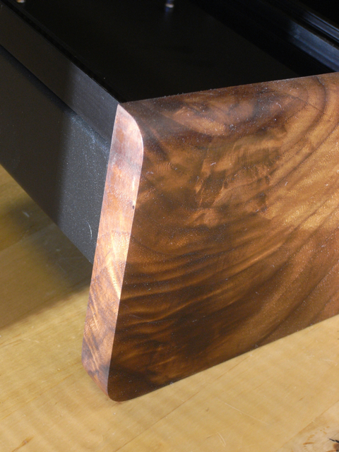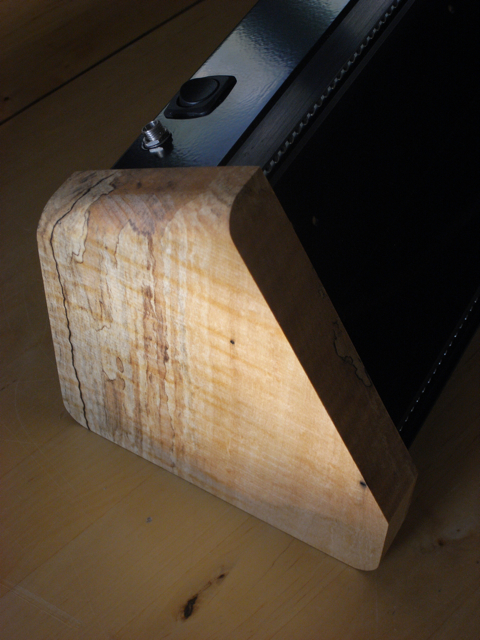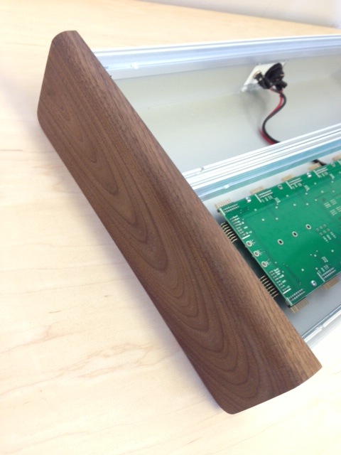 I've been having fun working on new shapes for the end cheeks for the new metal frames.  Here are a few in walnut and spalted maple.  I chose to use slightly oversized pieces of 1" thick wood for the smaller cases, as my experience patching with 3u and 6u desktop cases is that more weight helps resist the force of pulling cables out of recalcitrant jacks.   Plus, I just like the feel of them.